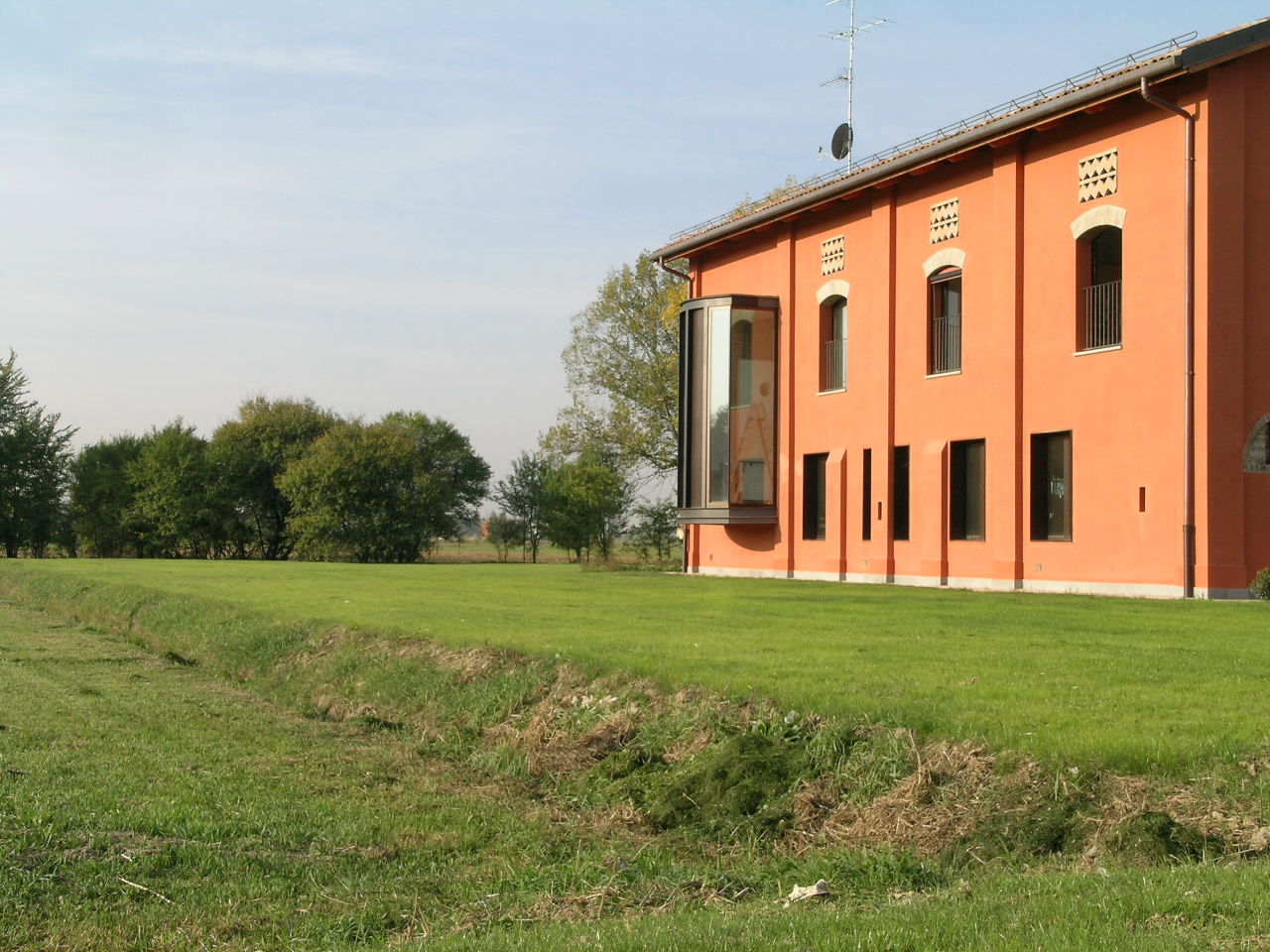 Il restauro operato ha consentito di salvare e portare a nuova vita tutta una serie di elementi del precedente uso agricolo come tagli e feritoie in parete, inferriate e ganci e soprattutto le colonne e le volte del fienile che, nate per il prezioso ricovero degli animali, sono oggi un luogo di piacevole contatto col sapore della storia recente. L’edificio è stato tutto rinforzato nelle fondazioni ed alcune colonne, oltre al processo di desalinizzazione, sono state fisicamente raddrizzate. All’esterno sono stati conservati alcuni muretti emergenti dal piano di campagna e il pozzo presente davanti alla casa. L’intervento principale nel fienile, l’introduzione di una scala prima non presente, è stato volutamente segnalato con un volume bow-window visibile all’esterno e da cui vedere brani di campagna. Il portico protettivo/schermo solare posto a sud delle ampie aperture del fienile è stato realizzato con tronchi sbozzati ed inerbito con essenze a foglia caduca quali il Glicine.