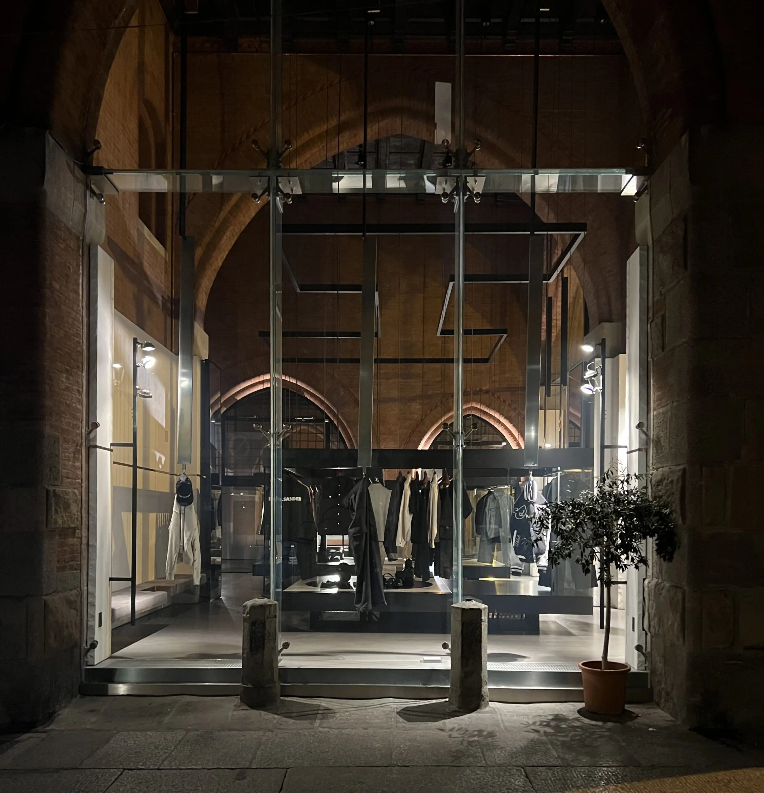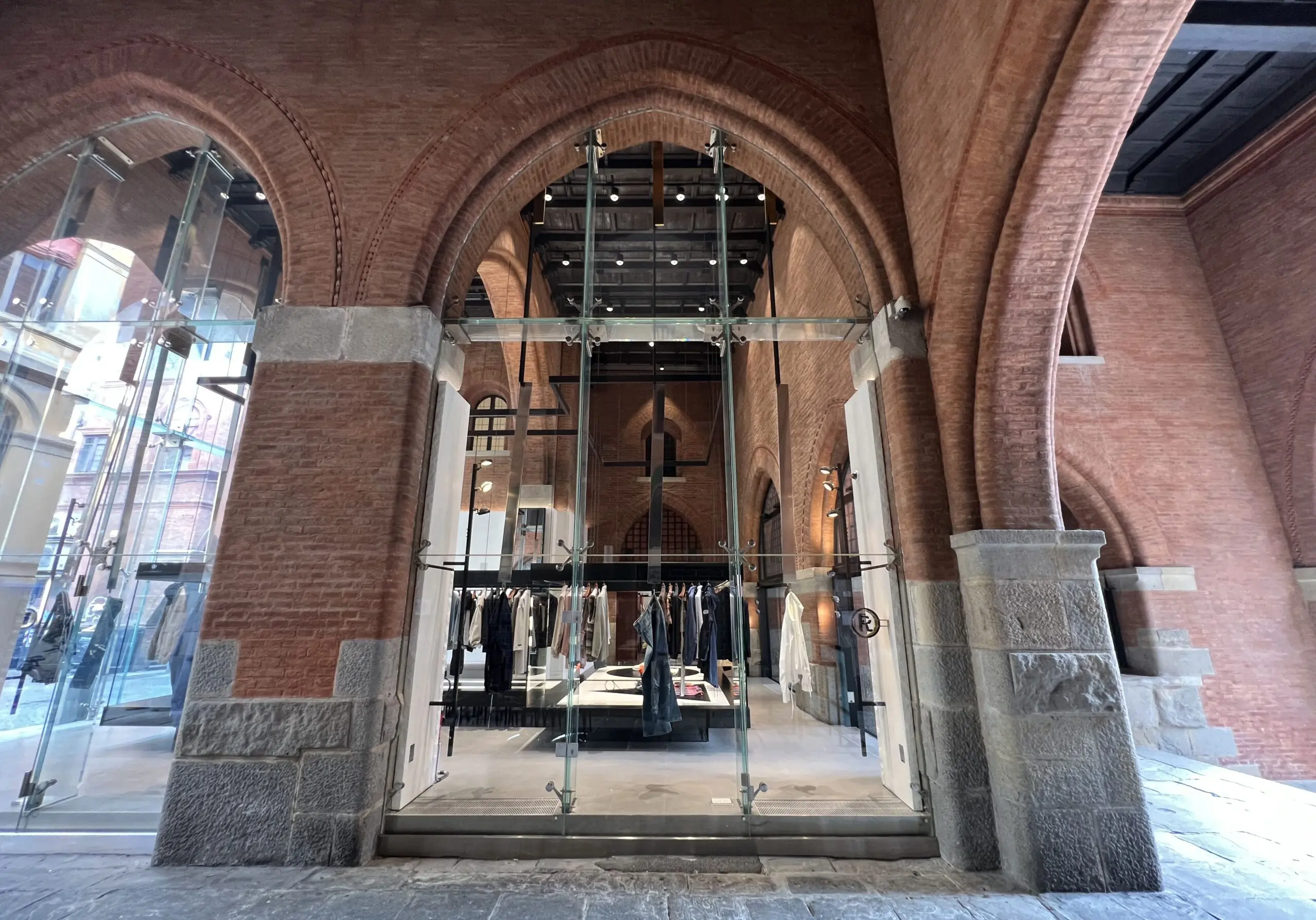 Progetti definitivo ed autorizzativo, esecutivo e direzione lavori per l’inserimento di pareti vetrate nel portico di Arata e per la realizzazione del progetto di interior design dello Studio Baciocchi per il nuovo negozio Ratti a Bologna.