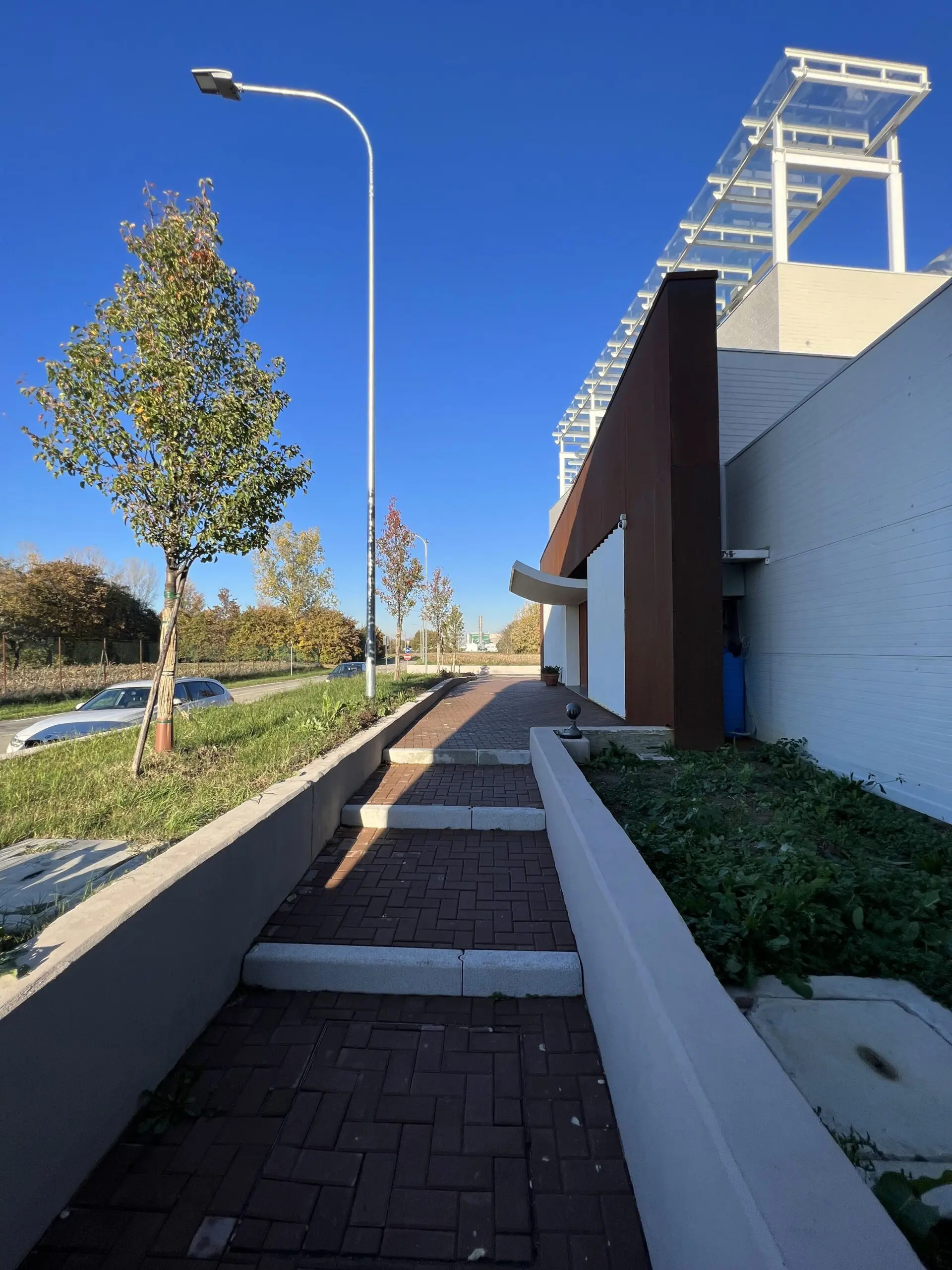 La parete dell’atrio di ingresso disposta parallelamente alla strada, rompe la regolarità dei muri ortogonali fra loro e contribuisce a dare allo spigolo nord-ovest del fabbricato espressività e dinamismo. Osserviamo che sarà il principale punto di vista da cui l’edificio sarà osservato dai visitatori in arrivo da Via Fiorini.