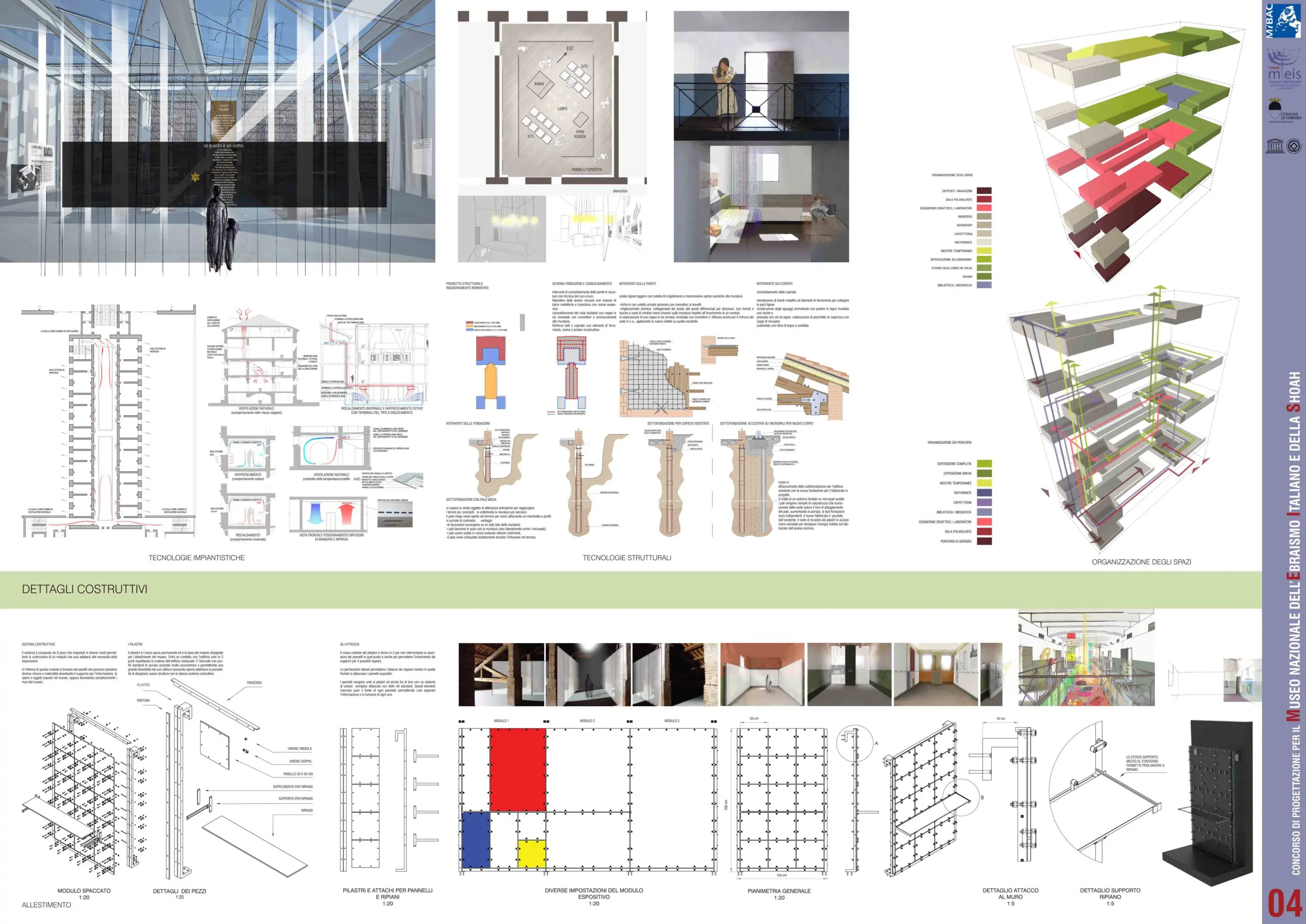 Perché il Museo nazionale ebraico italiano non sia e non diventi semplice “deposito” della memoria di un popolo e della sua cultura, ma partecipazione di questa memoria e della sua vitalità nel presente, viene narrato il percorso del radicamento delle comunità ebraiche delle origini, da Roma (il baricentro, sede di una delle più antiche comunità della Diaspora, con vaste implicazioni religiose e culturali per tutte le popolazioni del bacino mediterraneo), alla lenta diffusione dal sud Italia verso il nord del paese. Ricostruito con dovizia da sempre più numerose e approfondite ricerche (di cui fa fede anche il documento istruttorio dello stesso Concorso-MEIS), questo percorso storico costituisce anche il percorso del Museo. È una narrazione viva, con la quale si può interloquire, secondo il principio dialogico io-tu (Martin Buber), che indica anche l’incontro del medesimo col diverso, il luogo della possibilità di questo incontro, per rendere esplicita e interessante la “soggettività” del Museo della storia e della cultura ebraica italiana (delle comunità, personalità e centri di cultura ebraici) per la “oggettività” rappresentata dal più vasto pubblico nazionale e internazionale.