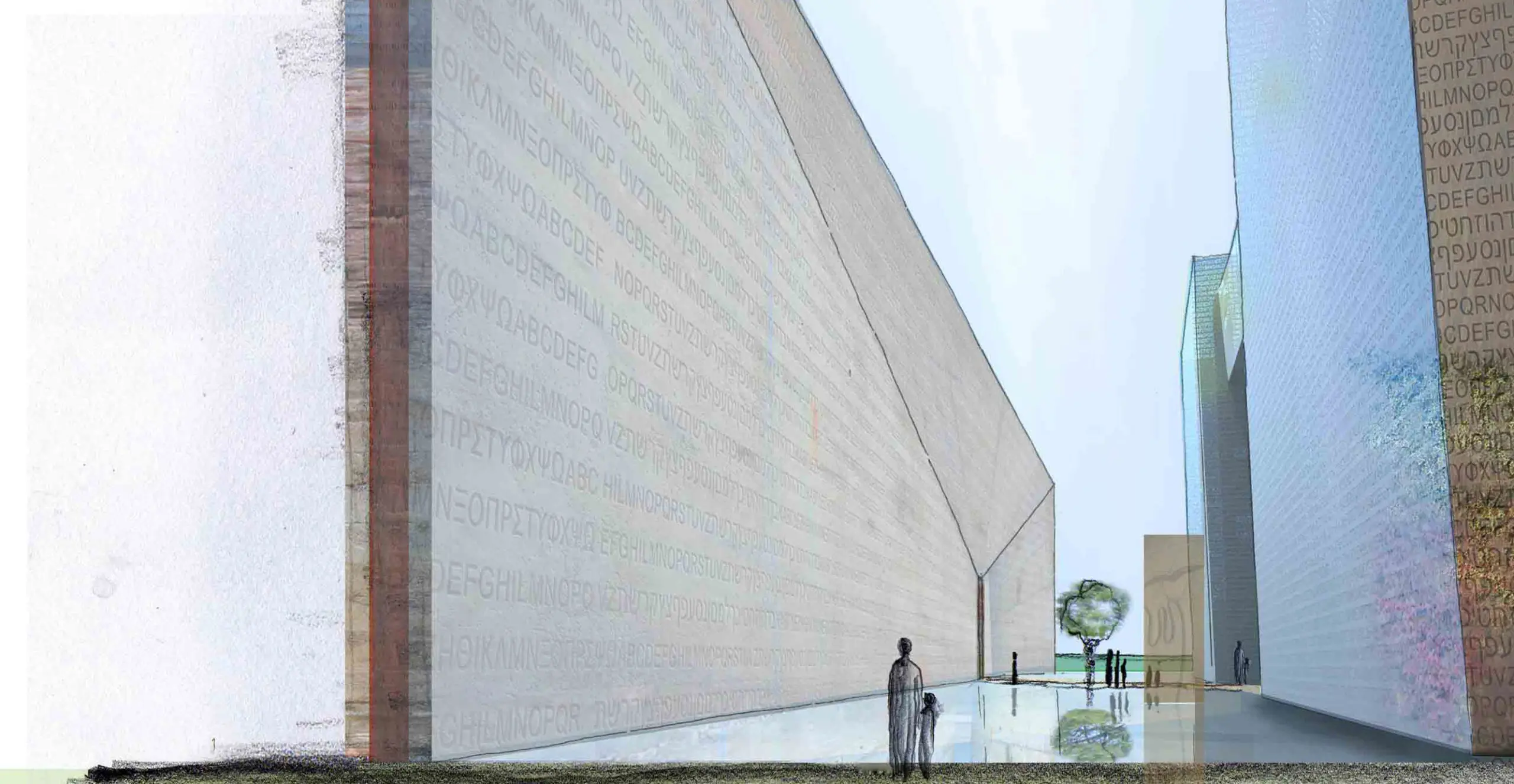 La qualità estetica delle parti aggiunte si basa sulla ricerca della trama del rivestimento dei volumi, integrando il tradizionale motivo tessile di matrice semperiana con il contenuto simbolico dell’alfabeto ebraico e delle sue interrelazioni con gli alfabeti greco e latino, uno scambio continuo, che ha contribuito a mantenere vivo l’ebraico, la lingua della Torà -il libro per eccellenza- preservandolo attraverso i secoli e attraverso le terre della diaspora e rendendolo ora lingua moderna di uno stato moderno. Le lettere ebraiche, così cariche di significati e in qualche modo testimoni della storia di un popolo e rappresentative della sua identità, si sono mescolate con le lettere degli altri alfabeti delle terre che ospitarono gli ebrei in diaspora – in particolare il greco del bacino del Mediterraneo e il latino della penisola italica – così come il modo di vivere, le tradizioni e il linguaggio degli ebrei si sono intersecate con i modi di vivere, le tradizioni e le lingue dei paesi ospitanti, senza mai perdere il legame con la legge ebraica.