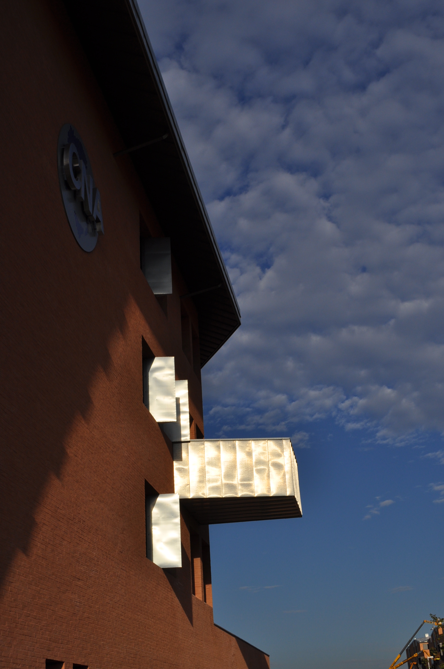 Sul lato sud, quattro livelli di pensiline fotovoltaiche (38 kwh) schermano in modo permanente le ampie vetrate dell’edificio. Sono completamente integrate nell’edificio e costituiscono uno schermo/diffusore di luce naturale/artificiale con una serie di led disposti inferiormente alle pensiline stesse.