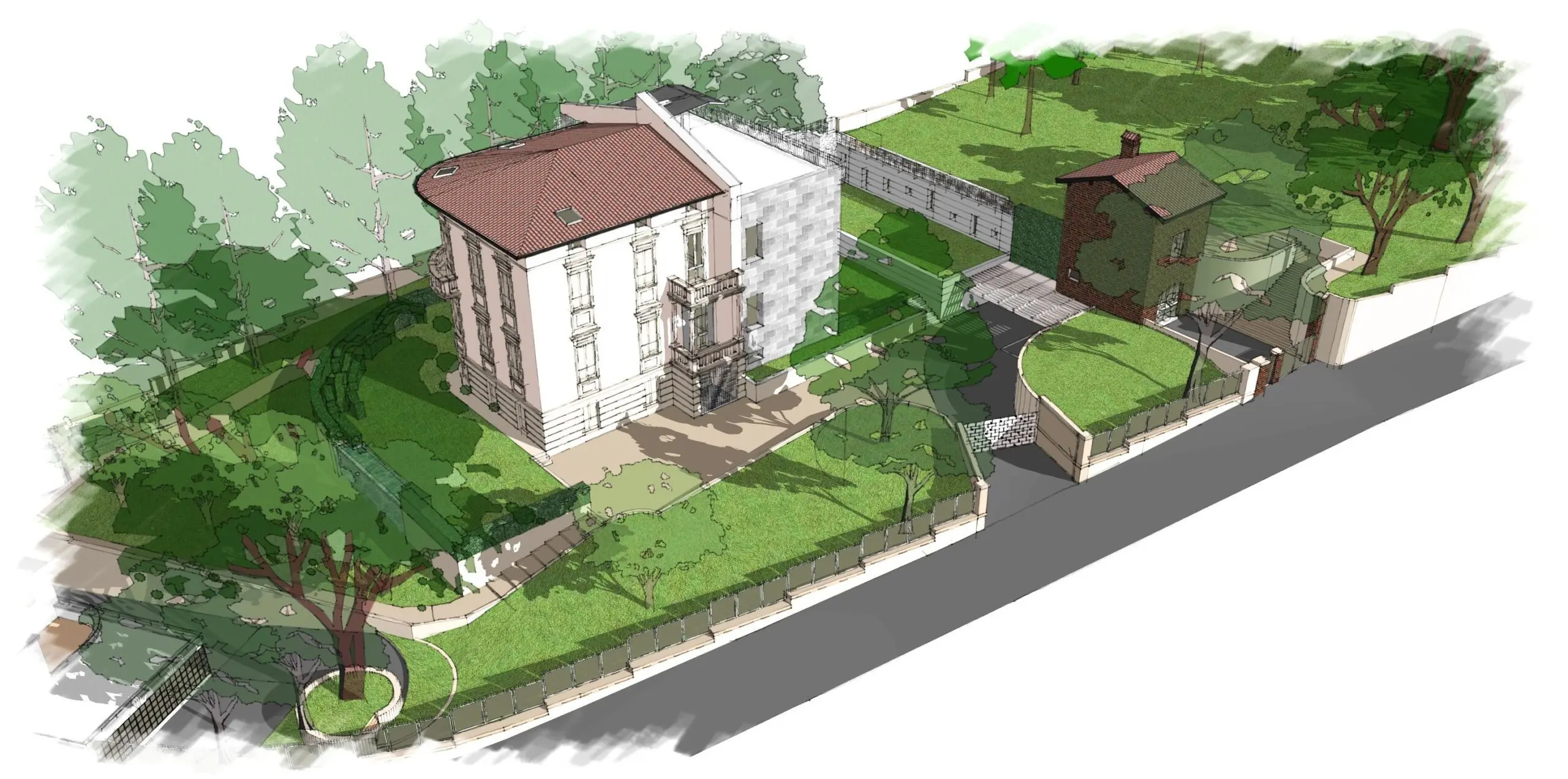 La nostra soluzione progettuale ha previsto l’eliminazione di tutto il muro di sostegno e dell’incongruo parapetto, ritrovando l’andamento del terreno originario e scoprendo il basamento del fabbricato. L’operazione di ridisegno progettuale degli esterni ha portato anche a trovare l’ingresso alla villa alla quota coincidente con l’attuale pavimento del piano ex-seminterrato e, attraverso la eliminazione della ripida e disagevole scala, consentire un facile accesso anche ai portatori di handicap motorio.