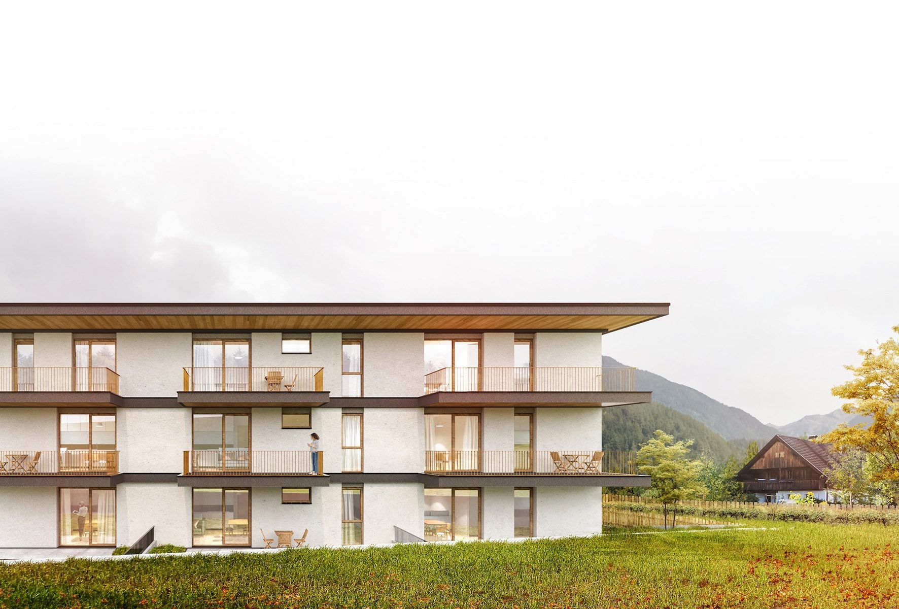 Il prospetto sud si immerge nel paesaggio naturale affacciandosi sulla collina erbosa e boschiva in direzione del Plan de Corones. Data la bellezza del contesto, e la riservatezza dovuta al fatto che il lotto A3 è l’ultimo a sud est della zona d’espansione, il prospetto sud è stato deputato interamente agli affacci della zona giorno, con grandi aperture quadrate (240x240cm) che danno sui terrazzi. Si tratta in definitiva di un prospetto abbastanza regolare, scandito dai marcapiani che si modellano per diventare la soletta dei balconi, in cui l’intento progettuale è offrire un inserimento armonico col contesto. Il parapetto dei balconi, profondi 180cm, è pensato in quadrelli di acciaio brunito, per limitare al minimo lo spessore degli elementi, accentuando così il senso di propensione all’esterno delle solette. Questo elemento metallico (verniciato grigio opaco, secondo prescrizioni del Piano Attuativo), contrasta con gli intradossi delle coperture e con gli infissi in legno, a cui è deputata la sensazione del calore domestico. La serialità delle dimensioni delle aperture, suddivise in 4 formati totali, tra finestre e portefinestre, rende economica e sostenibile la produzione.