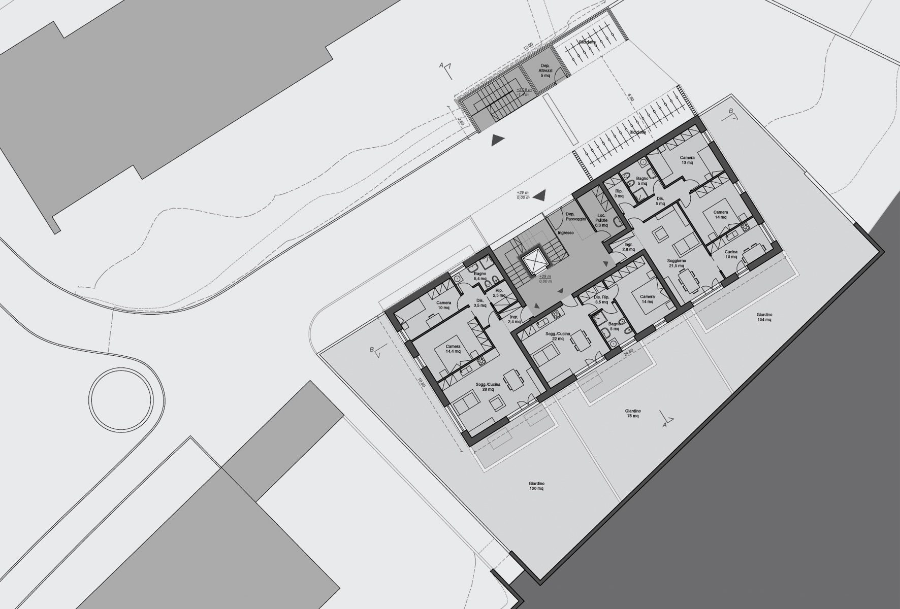 Il piano interrato si sviluppa su 2 quote sfalsate. Una (vincolata dal parcheggio esistente a cui occorre collegarsi) è posta a 24,20m (-4,80m rispetto alla quota di ingresso che si trova a +29m); l’altra è stabilita a quota 25,90m (-3,10 m) alla quale sono situate tutte le cantine. Questo sfalsamento dei livelli è necessario in quanto l’altezza dei locali tecnici, se fossero posti tutti alla quota di 24,2m, sarebbero di un’altezza spropositata ed irragionevole. Tutti i locali, a qualsiasi livello, sono accessibili dai vani scala e dagli ascensori, e messi in collegamento tra di loro.